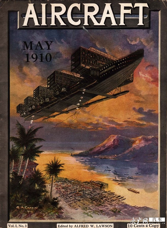 1910年5月期的《飛行器》雜志封面,展示了一種具有未來(lái)派色彩的飛行器!讹w行器》雜志在紐約刊印。