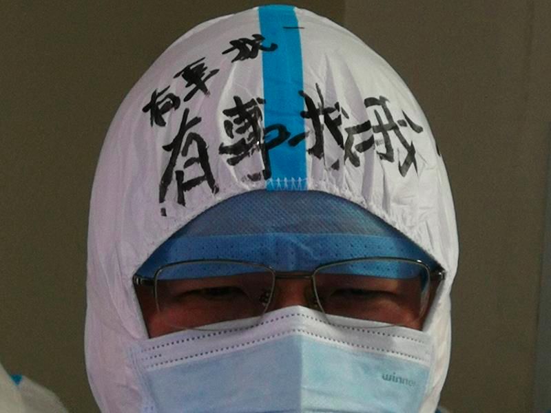 在隔離病房內(nèi),當醫(yī)護人員穿上防護服,帶上口罩和護目鏡以后,互相之間難以辨識。有隊友問:“有事兒找誰?”丁新民立刻回答:“有事找我!”話音剛落,只見丁新民真的把頭低下,“有事找我”4個大字就這樣“頂”在了他的額頭上。