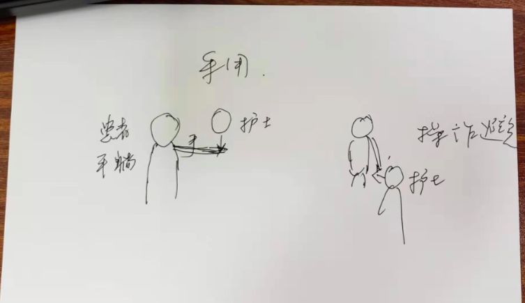 于是,在北京醫(yī)療隊首次接診期間,丁新民在工作微信群里上傳了一張自己的“畫作”:畫面中一個小人平抬著胳膊,旁邊有一個圓圈,箭頭標注這個圓圈代表著一名護士。在非專業(yè)人士看來,這幅簡易畫簡直“不知所云”,可每位醫(yī)護人員看到這幅畫,都有著說不出的感動。