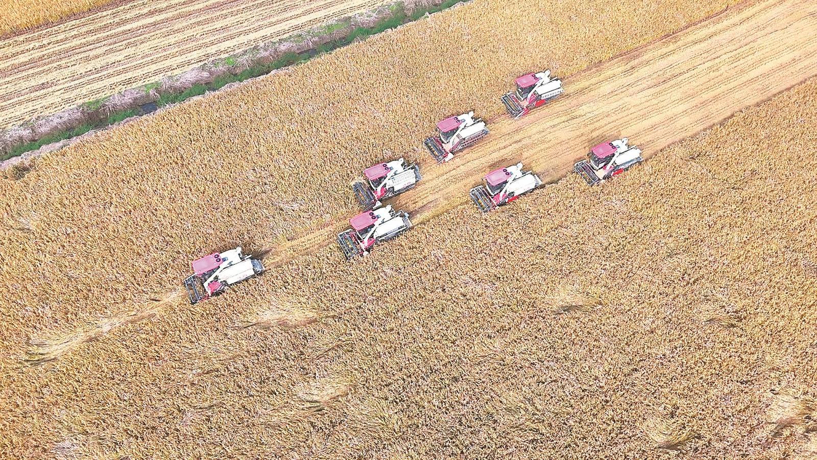 10月29日,位于壽縣的安徽農(nóng)墾集團(tuán)壽西湖農(nóng)場(chǎng),金黃色的稻浪隨風(fēng)起伏,多臺(tái)收割機(jī)開足馬力,在田間來回穿梭,構(gòu)成了一幅壯美的豐收畫卷。今年夏種,壽西湖農(nóng)場(chǎng)共種植了4.8萬畝的大豆和5000畝的水稻,大豆基本收獲完畢,水稻正加緊收獲。來自省農(nóng)業(yè)農(nóng)村廳的數(shù)據(jù)顯示,截至10月30日15時(shí),全省已收秋糧面積近6000萬畝,收獲進(jìn)度超九成。其中,已收一季稻超2900萬畝,進(jìn)度過九成,玉米、大豆已完成收獲。(記者羅廣心 許昊杰圖/文)