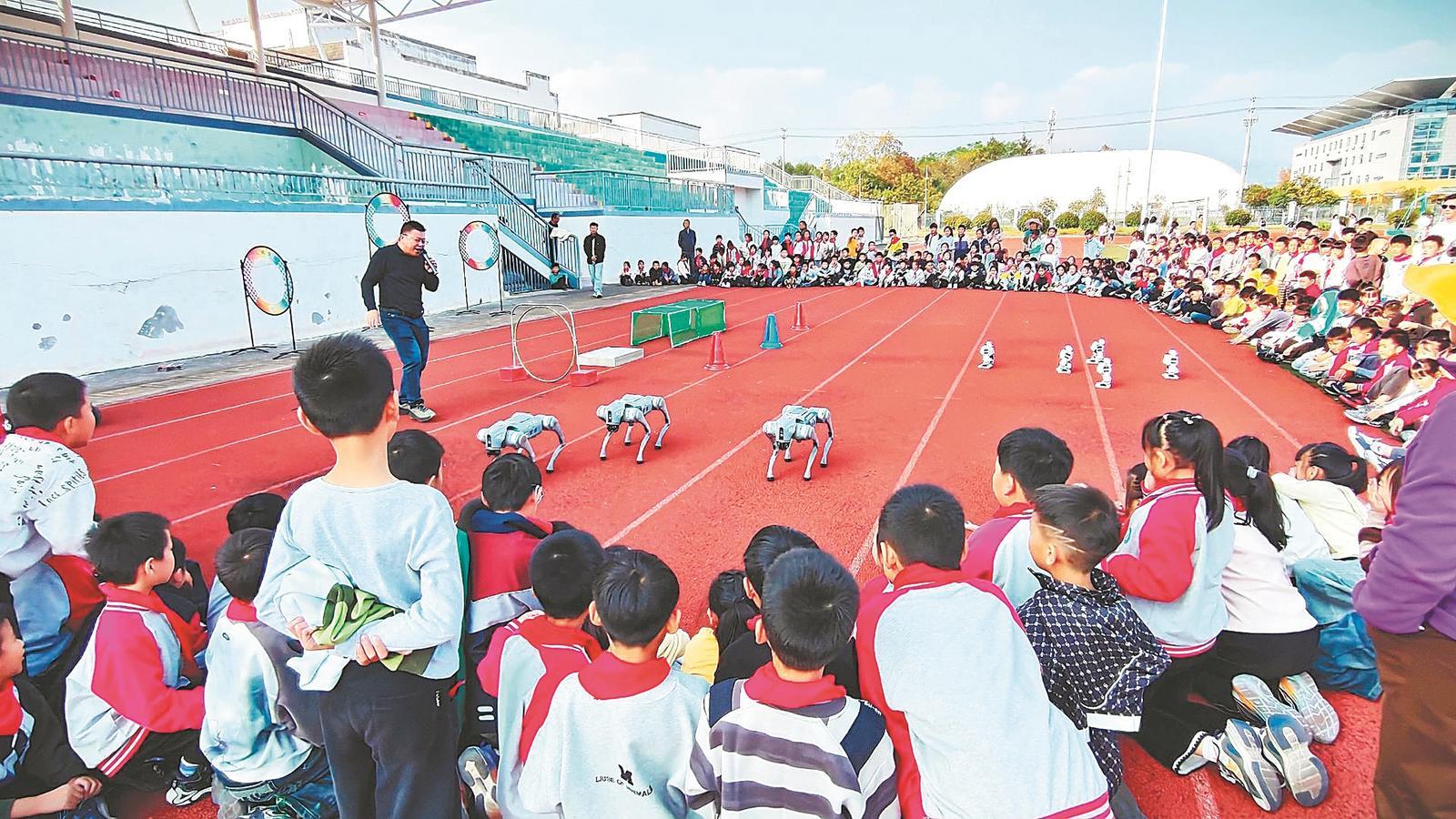 10月28日,在黃山市黟縣碧陽小學操場上,小朋友在和機器狗、機器人快樂互動。當日,該縣組織專業(yè)研學團隊走進校園開展科普展演活動,孩子們通過觀看機器人表演、與機器狗互動等方式,沉浸式感受人工智能技術的魅力。(記者朱光明 俞培)