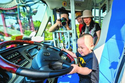 昨天,在北京公交駕校,小朋友坐上最新款電動公交車駕駛座拍照留念。本報記者 鄧偉攝