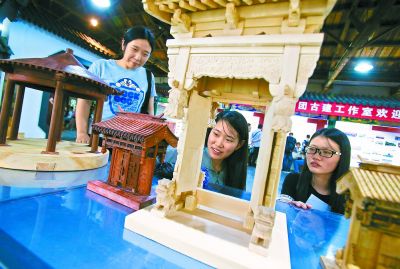 昨天,參觀者在北京房地集團(tuán)古建工作室內(nèi)觀看傳統(tǒng)建筑模型。 本報記者 武亦彬攝