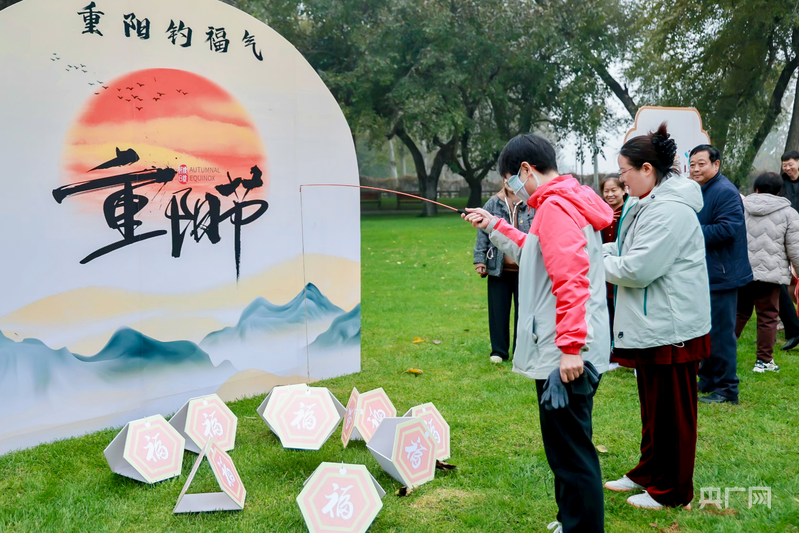 游園區(qū)域同樣人流如織。書法創(chuàng)作區(qū),長者揮毫潑墨,筆走龍蛇間盡顯儒雅風范;“釣福氣”、投壺、錘丸等傳統(tǒng)游戲,讓老人們在趣味互動中重拾舊時記憶,歡聲笑語不絕于耳。手作區(qū)內,居民共同制作重陽糕、縫制茱萸香囊,在親身參與中感受傳統(tǒng)節(jié)俗的溫度。