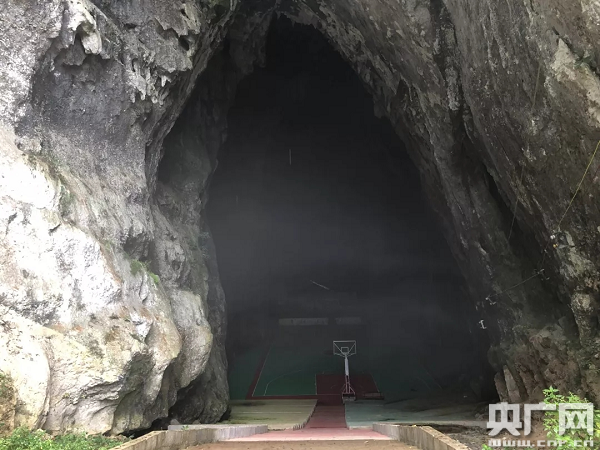 張開學(xué)告訴記者:“當(dāng)時體育器材什么都沒有,就只有這么一個溶洞。最開始只想把它填平,后來發(fā)現(xiàn)正好可以搞塊籃球場。”