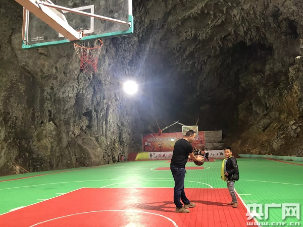 籃球場出現(xiàn)在足有十層樓高、百來米深的天然溶洞里。今年79歲的老村支書張開學(xué)說,家門前的這座溶洞籃球場,是村里的新名片。