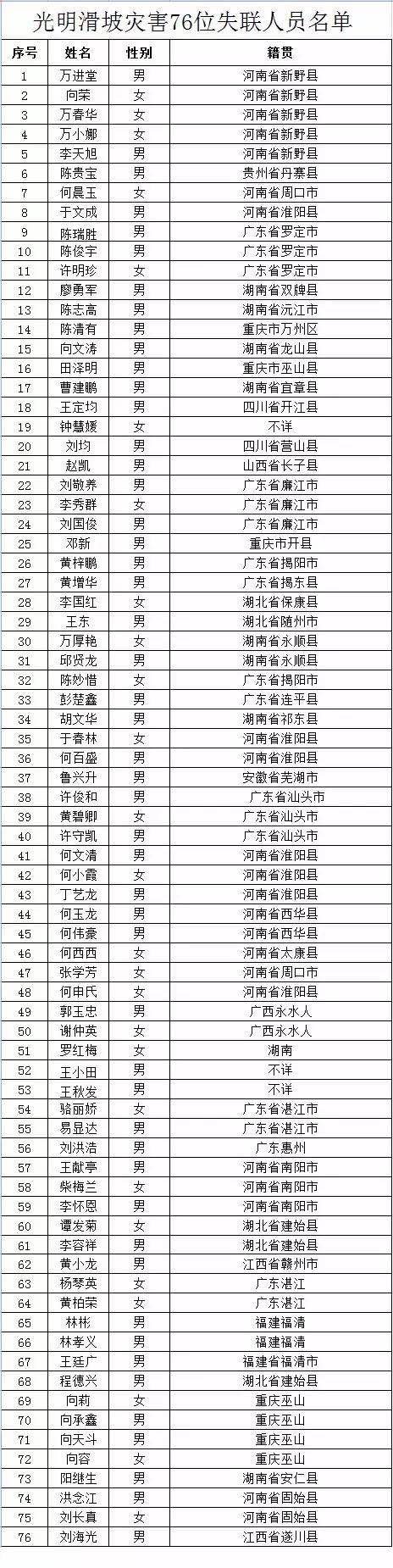 深圳山體滑坡76名失聯人員名單公布 多數為外來務工人員
