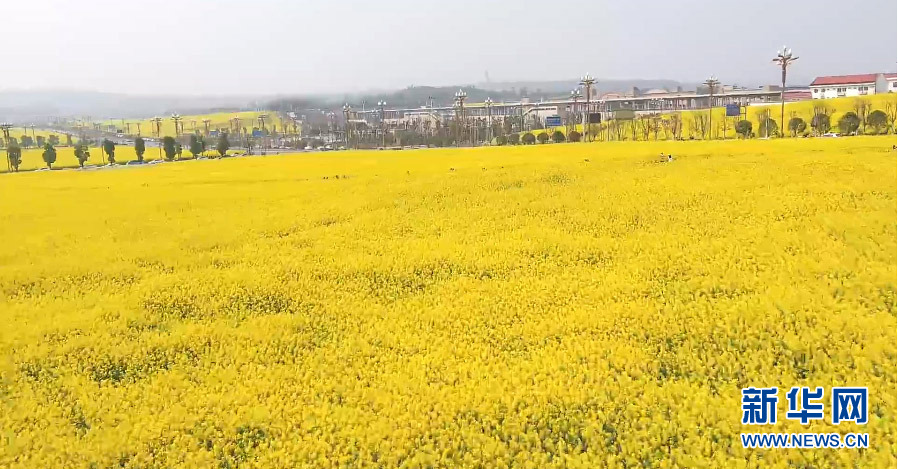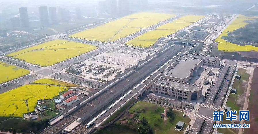 一列列動車從金黃色的花海中駛過,宛如開往春天的高鐵。新華網(wǎng) 向進 攝