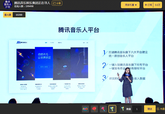 隨后騰訊音樂娛樂集團戰(zhàn)略發(fā)展部總經(jīng)理羅羿對此進行了補充,并通過產(chǎn)品“騰訊音樂人平臺”的介紹詳細解釋如何通過打通六大平臺為音樂人提供支持。