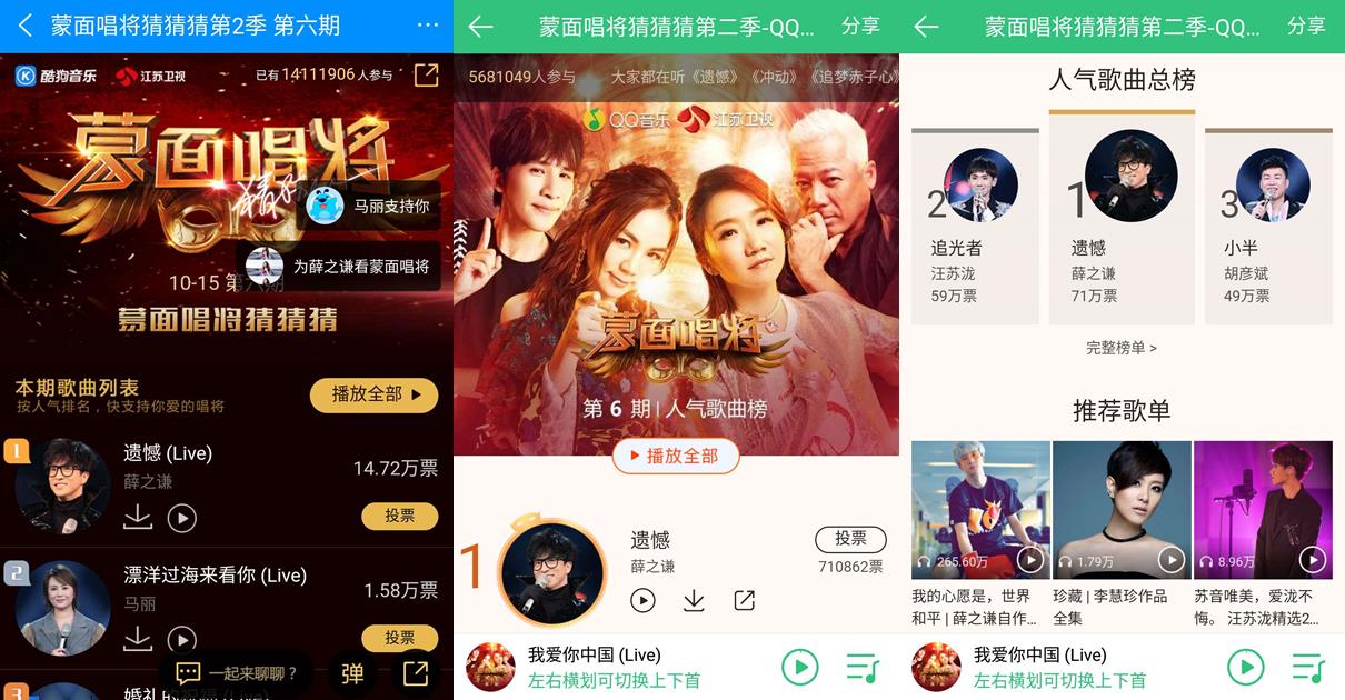 在當(dāng)晚的節(jié)目中,率先征戰(zhàn)的“風(fēng)中凌亂的小公舉”頭頂小風(fēng)車,以一曲純凈通透的《漂洋過海來看你》感動(dòng)全場(chǎng),由于陶晶瑩的缺席,猜評(píng)團(tuán)甚至一度認(rèn)為就是陶子姐。不過憑借獨(dú)特的聲音特質(zhì),“來自東北的馬麗”還是在采訪環(huán)節(jié)被認(rèn)出真“聲”,對(duì)于其“被喜劇掩蓋的音樂天賦”,QQ音樂網(wǎng)友也表示驚艷。而另一位新晉登臺(tái)的“刺”也遭聲線“出賣”,一張口就被認(rèn)出是薛之謙本人,一曲《遺憾》唱盡悲歡離合,不僅與馬麗雙雙登上酷狗音樂蒙面唱將猜猜猜的人氣榜前兩位,更以68萬票“空降”QQ音樂當(dāng)期人氣歌曲榜和人氣歌曲總榜冠軍,成為最強(qiáng)補(bǔ)位唱將。