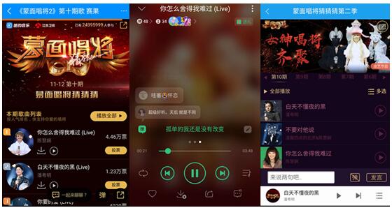 蟬聯(lián)9周收視冠軍,上周日晚播出的《蒙面唱將猜猜猜》第二季第10期節(jié)目再次洶涌來襲。除了有潘粵明為夢踢館、蔣敦豪挑戰(zhàn)自我,陳慧嫻、陳明兩位經(jīng)典女伶的現(xiàn)身更是掀起一波回憶殺。作為節(jié)目的專享音頻合作伙伴,騰訊音樂娛樂集團(tuán)三大平臺QQ音樂、酷狗音樂、酷我音樂不僅通過高品質(zhì)零時差專輯同步見證驚喜,更帶來特色化的榜單、互動,與廣大網(wǎng)友共同追憶了音樂的黃金時代。