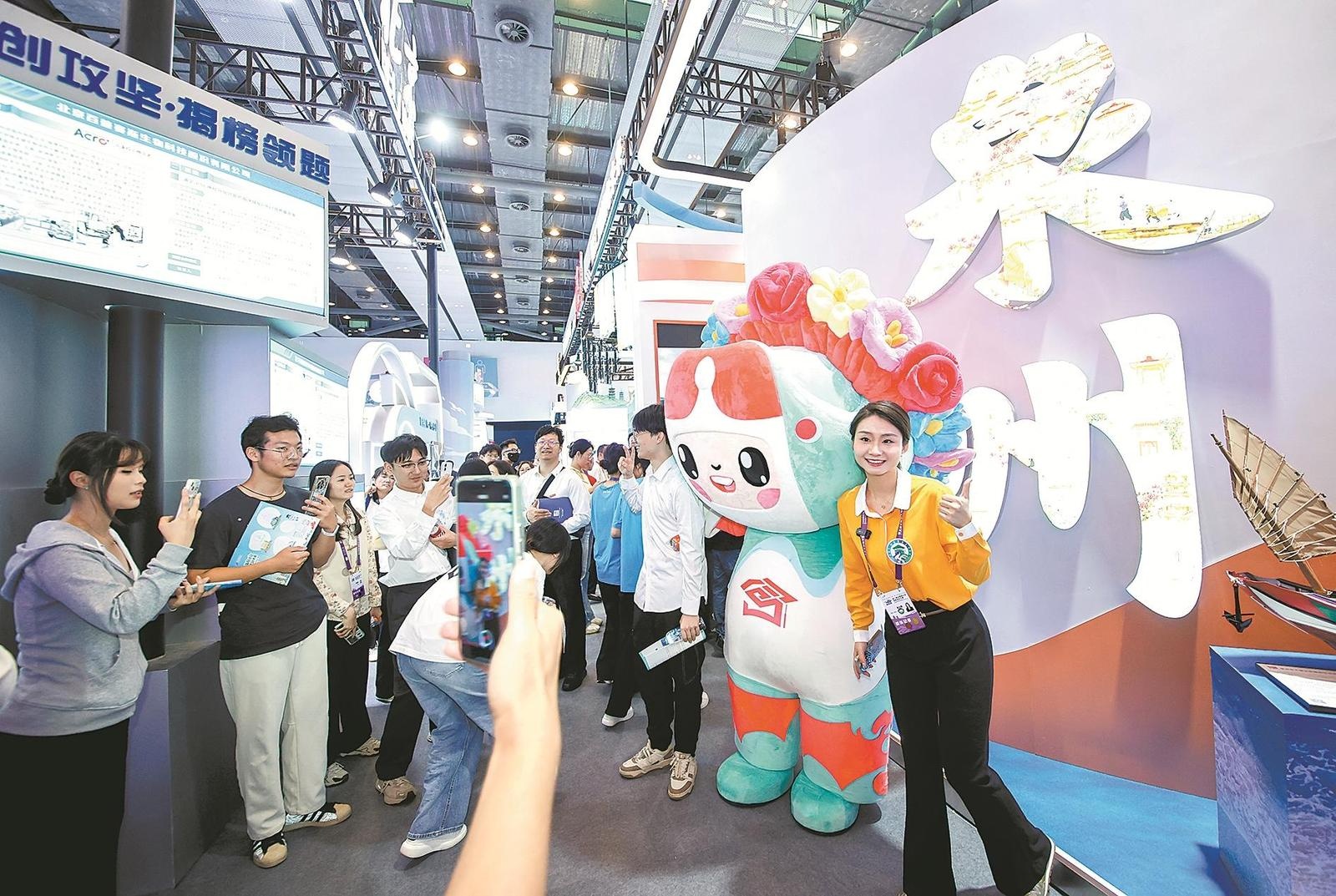 本屆博創(chuàng)賽吉祥物“福創(chuàng)創(chuàng)”亮相泉州館(融媒體記者 林勁峰 攝)