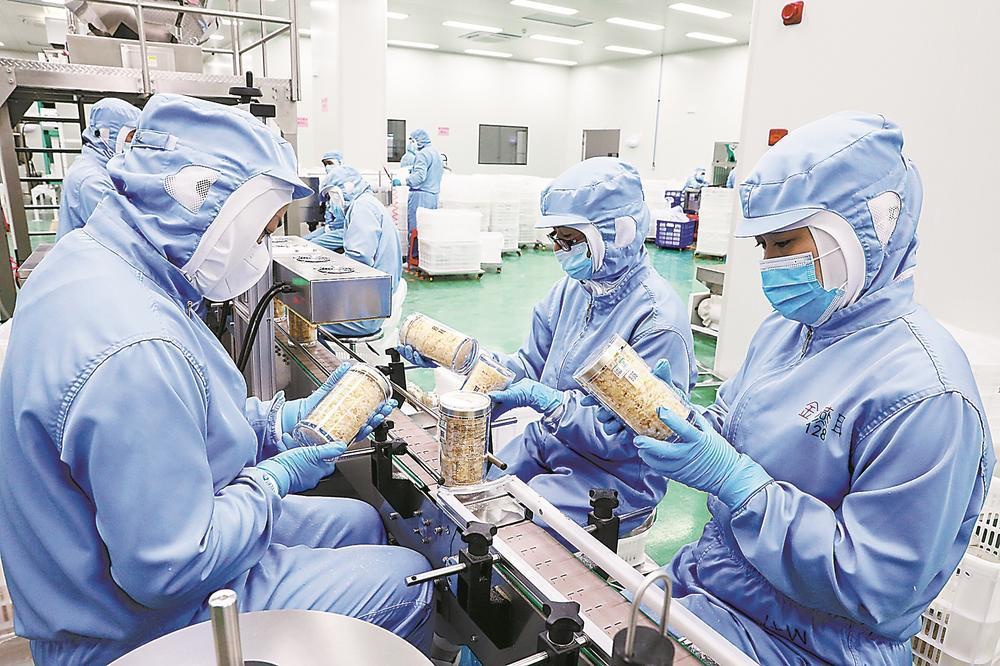 在古田一銀耳現(xiàn)代化生產(chǎn)車間,工人在進行本草銀耳產(chǎn)品的包裝作業(yè)(蔣煒煌 攝)