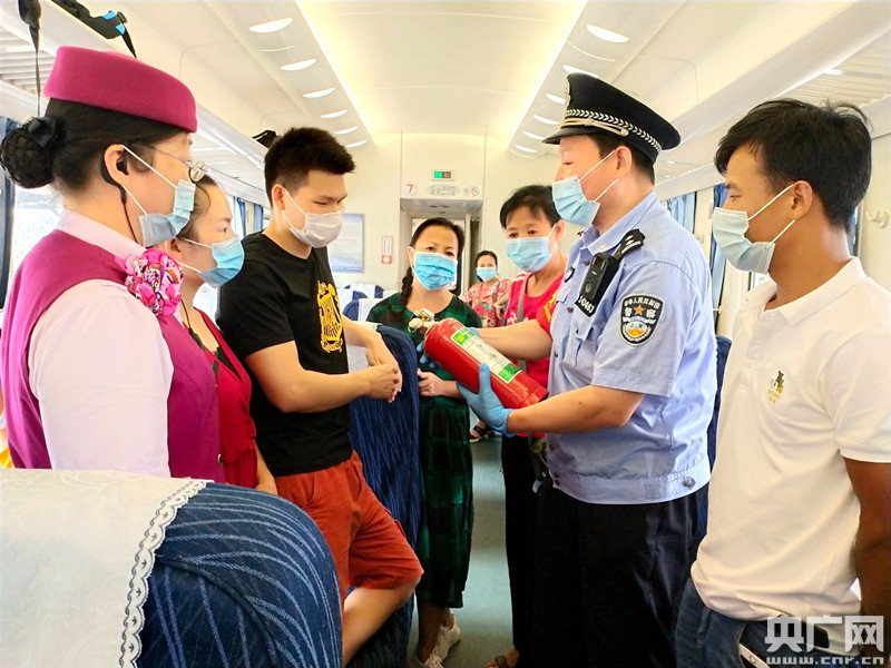 乘警長張邵軍給隨行家長和年紀(jì)比較大的孩子講列車消防知識(shí)(央廣網(wǎng)發(fā) 通訊員供圖)