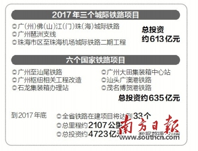這3個(gè)城際鐵路項(xiàng)目分別是廣(州)佛(山)江(門)珠(海)城際鐵路、廣州琶洲支線,以及珠海市區(qū)至珠海機(jī)場(chǎng)城際鐵路二期工程,總投資約613億元;6個(gè)國家鐵路項(xiàng)目分別是廣州至汕尾鐵路、廣州樞紐相關(guān)工程改造、石龍集裝箱辦理站、廣州大田集裝箱中心站、汕頭廣澳港鐵路、茂名博賀港鐵路,總投資約635億元。