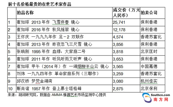 73歲的國畫家崔如琢連續(xù)三年蟬聯(lián)胡潤藝術(shù)榜榜首,成交額比去年增長5%,再創(chuàng)新高,達(dá)到8.2億元。他的8.2億元成交額共來自76幅作品,比去年的126幅少了4成。其中,崔如琢2013年作《飛雪伴春 鏡心》是去年在世藝術(shù)家成交額最高的作品,由保利香港以2.6億元的高價拍出。分析指出,崔如琢已連續(xù)八年入圍胡潤藝術(shù)榜,這五年一直保持在前十名。