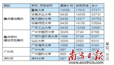根據(jù)公示方案,今年廣東將投入15億元支持高水平大學(xué)建設(shè)。其中,超過(guò)14.2億元投入9所省屬學(xué)校,暨南大學(xué)、華南農(nóng)業(yè)大學(xué)、南方醫(yī)科大學(xué)、華南師范大學(xué)、廣東工業(yè)大學(xué)5所高水平大學(xué)重點(diǎn)建設(shè)高校獲2.2億元—2.7億元不等的專項(xiàng)資金;廣州中醫(yī)藥大學(xué)、廣東外語(yǔ)外貿(mào)大學(xué)、汕頭大學(xué)和廣東海洋大學(xué)4所重點(diǎn)學(xué)科建設(shè)項(xiàng)目高校共獲超2.2億元的資金支持。