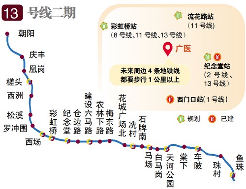 人民路與東風(fēng)路的交界處,可謂地鐵“盲區(qū)”:以十字路口為圓心,未來(lái)周邊1公里范圍內(nèi)將有4條地鐵線、4個(gè)地鐵站——1號(hào)線(西門口站)、8號(hào)線(彩虹橋站)、11號(hào)線(彩虹橋站、流花路站)、13號(hào)線(彩虹橋站、紀(jì)念堂站),但最近的車站都要步行約1公里。13號(hào)線二期經(jīng)過(guò)而不設(shè)站,周邊街坊覺(jué)得尤為遺憾。