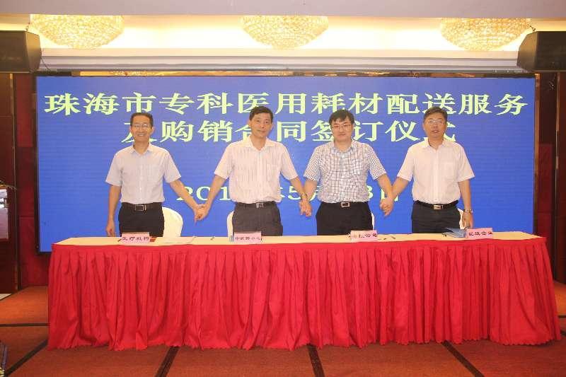 珠海市醫(yī)管中心(監(jiān)管方)、廣東海虹藥通電子商務(wù)有限公司(平臺方)、全市64家公立醫(yī)療衛(wèi)生和計生服務(wù)機構(gòu)(購買方)、12家配送企業(yè)(銷售方)代表簽訂了四方合同。