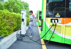 充電中的電動(dòng)公交車。廣報(bào)記者駱昌威攝(資料圖片)