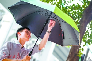 昨日上午,記者沿著他介紹的路線進行巡視,然而,在婦兒中心附近、暨南大學附近等好幾個點,都沒有發(fā)現(xiàn)共享e傘的影子。多番巡視后記者才發(fā)現(xiàn),在體育西路與黃埔大道相交處附近的環(huán)衛(wèi)工工具房邊有8把e傘;另外在相隔此處約百米的黃埔大道北側護欄上也有十余把傘;在中山路上的傘則相對較多。