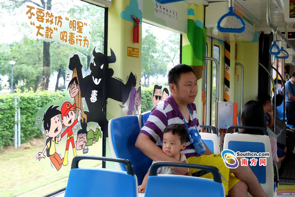 記者在現(xiàn)場(chǎng)見到,有軌電車“禁毒專列”里充滿禁毒宣傳元素,讓人眼前一亮。