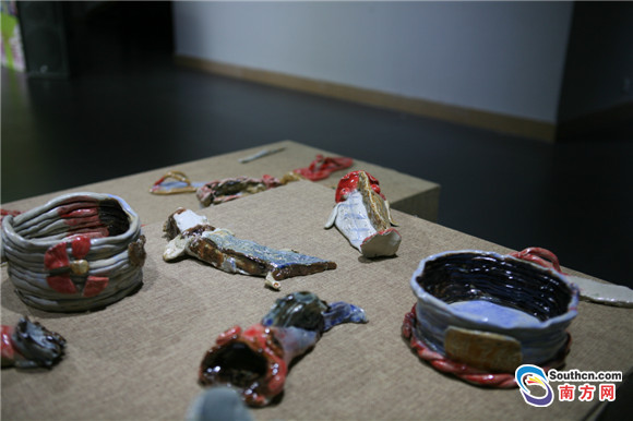 6月15日,廣州市文瀛藝術(shù)高地美術(shù)館的墻面上整齊地懸掛著裝裱精致的繪畫(huà)作品;木質(zhì)展臺(tái)上陳列著色彩斑斕的陶藝制品,在燈光照射下閃閃發(fā)亮。