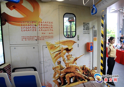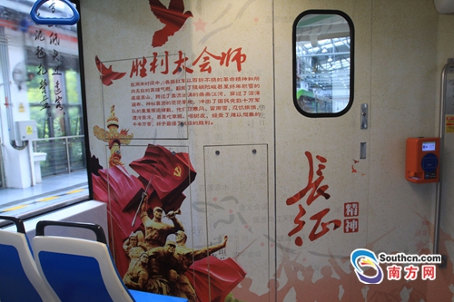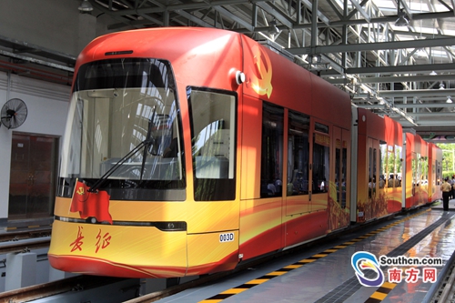 據(jù)南方網(wǎng)報道,車身以紅色為主體,車廂內(nèi)以壁畫和詩詞的形式展現(xiàn)長征的光輝歷程,乘客掃描車身二維碼還可了解更多長征故事……6月29日,為慶祝建黨96周年,廣州地鐵“長征號”紅色主題列車在有軌電車正式上線。市民今日起可以“坐上電車學(xué)紅史、沿著軌道尋精神”。