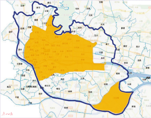 具體的擴大區(qū)域包括:海珠區(qū)原限制區(qū)外所有區(qū)域;荔灣區(qū)橋中街;天河區(qū)沙東街、興華街、五山街、棠下街、天園街、員村街;白云區(qū)三元里街、云城街、新市街、棠景街、同德街、松洲街。(黃色區(qū)域為原限制區(qū),藍色線區(qū)域為擴大后區(qū)域)