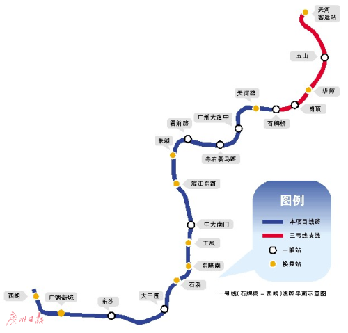 線路圖顯示,十號線共設置14座車站,其中換乘站8座,分別為天河路(換乘一、三號線)、東湖(換乘六、十二號線)、濱江東路(換乘十九號線)、五鳳(換乘十一號線)、東曉南(換乘二號線)、石溪(換乘廣佛線)、廣鋼新城(換乘佛山十一號線)、西朗(換乘一、二十二、廣佛線)。