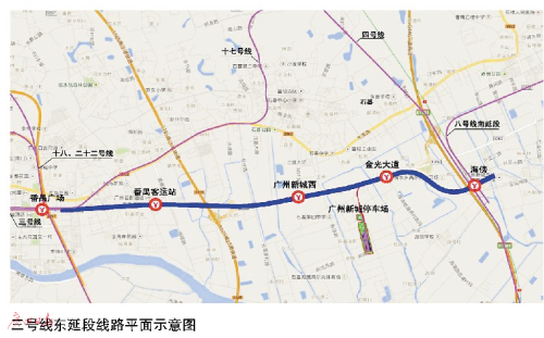 三號線東延段(番禺廣場-海傍)全長9.58公里,均為地下線。線路西起于三號線番禺廣場站,沿亞運大道向東延伸,共設4座車站,自西往東依次為番禺客運站、廣州新城西、金光大道和海傍。其中換乘站1座,為海傍站,可換乘已通車的四號線,及遠期規(guī)劃的八號線南延段。