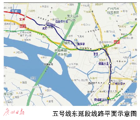 五號線東延段(文沖-黃埔客運港)全長9.76公里,全部為地下線。線路西起五號線文沖站,途經(jīng)雙崗、黃埔東路、開發(fā)大道,共設車站6座(不含文沖),西往東依次為雙崗、廟頭路、夏園、保盈大道、廣州開發(fā)區(qū)、黃埔客運港。其中換乘站2座,夏園換乘地鐵十三號線,黃埔客運港換乘遠期規(guī)劃的八號線支線、東莞一號線。