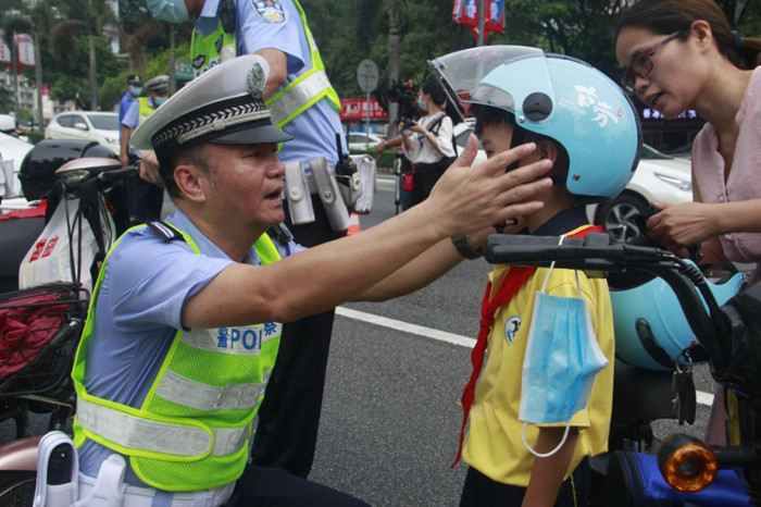 對(duì)電動(dòng)車不帶頭盔和行人闖紅燈的行為進(jìn)行勸阻。鶴山交警聯(lián)合志愿者在城區(qū)各個(gè)路口都設(shè)置了勸導(dǎo)崗,對(duì)行人闖紅燈和電動(dòng)車不戴頭盔等違法行為都進(jìn)行勸阻,告知其危害。同時(shí),贈(zèng)送了一大批頭盔給鶴山市民。