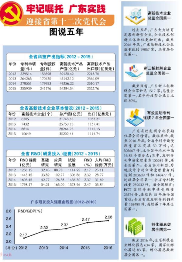 據(jù)廣州日?qǐng)?bào)報(bào)道:2016年,廣東高新技術(shù)企業(yè)數(shù)量達(dá)到19857家,總量居全國(guó)第一;區(qū)域創(chuàng)新能力綜合排名連續(xù)9年位居全國(guó)第二,躋身創(chuàng)新型省份;科技投入產(chǎn)出持續(xù)增加,全省研發(fā)(R&D)投入占GDP比重提高到2.58%,發(fā)明專利申請(qǐng)量和PCT國(guó)際專利申請(qǐng)量同比增長(zhǎng)均超過50%;關(guān)鍵核心技術(shù)不斷獲得突破,技術(shù)自給率達(dá)71%;高新技術(shù)產(chǎn)品產(chǎn)值超過5.3萬億元,占工業(yè)總產(chǎn)值的39%。