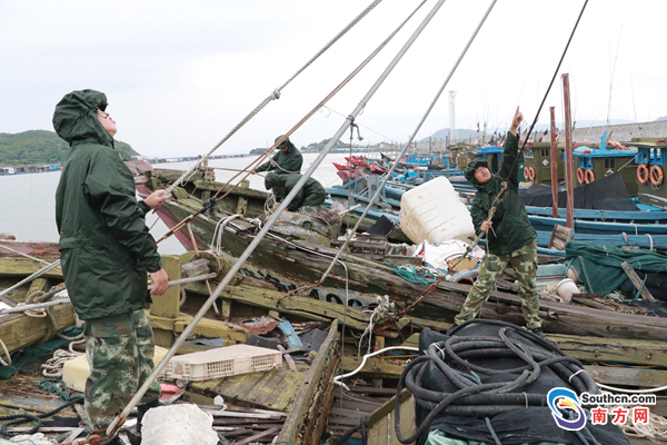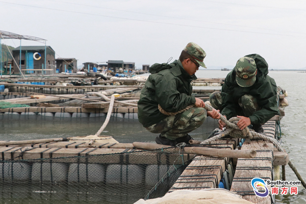 在饒平縣柘林港灣,潮州邊防官兵一大早就進行排查,勸阻漁民歸港避風,并對留守在避風船、養(yǎng)殖魚排及沿海房屋內(nèi)的漁船民進行防風宣傳和囑咐,并協(xié)助他們做好加固工作,要求他們減少戶外零碎物件,防止在臺風天氣中出現(xiàn)飛物砸人的情況發(fā)生。據(jù)悉,潮州全市出海船只684艘全部回港避風,海上作業(yè)人員4916人全部撤離上岸,饒平縣“三無”船只2296艘已全部進港避風。