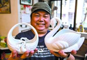 黃昌就保留下來(lái)的當(dāng)年白天鵝賓館給貴賓房間放水果用的陶瓷果籃(左)和陶瓷擺件。