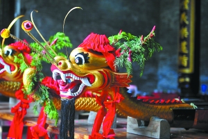 鑼鼓聲聲迎端午,龍舟競渡鬧民俗。車陂村男女老少無不期待著龍舟賽事這一天。19日,村內(nèi)的晴川蘇公祠前鞭炮齊鳴、熱鬧非凡,有著150多年“扒龍舟”傳統(tǒng)的車陂村在這里舉辦“采青”儀式,采摘新鮮龍眼葉、柏枝等祭祀品,并將紅布扎成的彩球掛在龍頭上,完成這一儀式標(biāo)志著龍船已經(jīng)完全“蘇醒”。