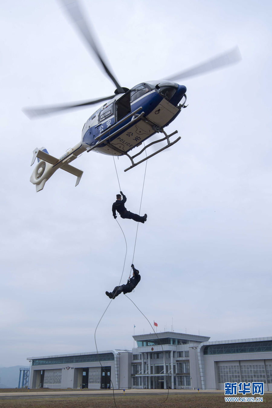 年初,來(lái)自廣州市特警支隊(duì)的18名學(xué)員參加廣東省公安廳舉辦的第一期直升機(jī)索降技能合成訓(xùn)練,共計(jì)飛行6小時(shí)多、80架次。圖為,直升機(jī)索降技能合成訓(xùn)練。新華網(wǎng)發(fā)