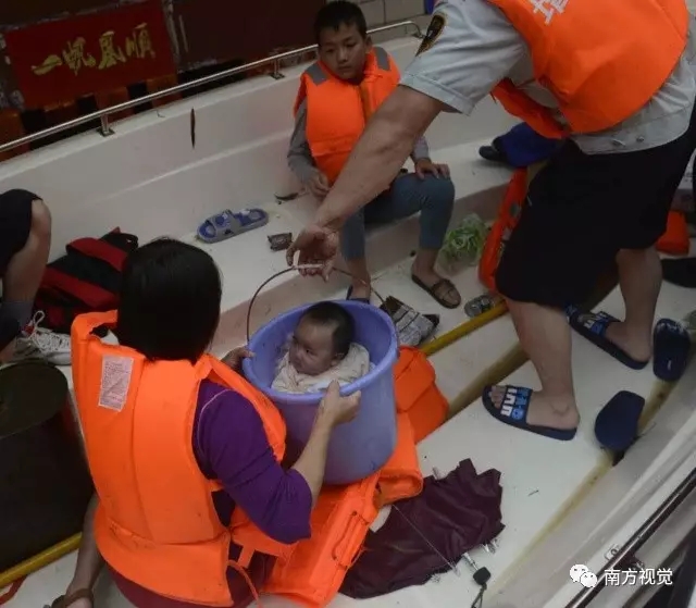 村民在三防隊(duì)員的幫助下,用水桶將嬰兒救出。