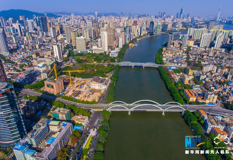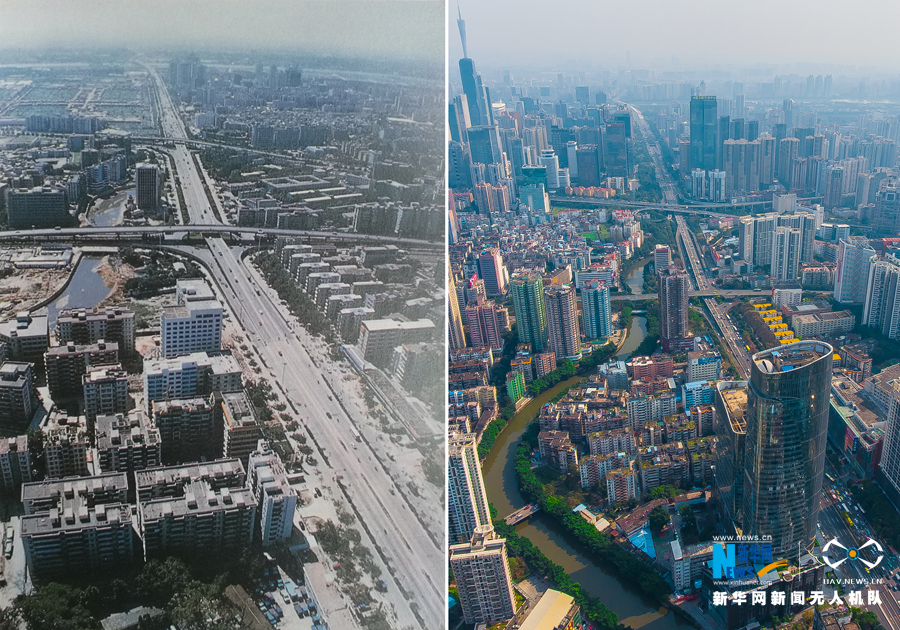 《廣州城建豐碑》一書里面收錄了幾張難得一見的航拍老照片。日前,新華網(wǎng)無人機在相同角度實拍對比,記錄了廣州城市交通及周邊環(huán)境的變遷。