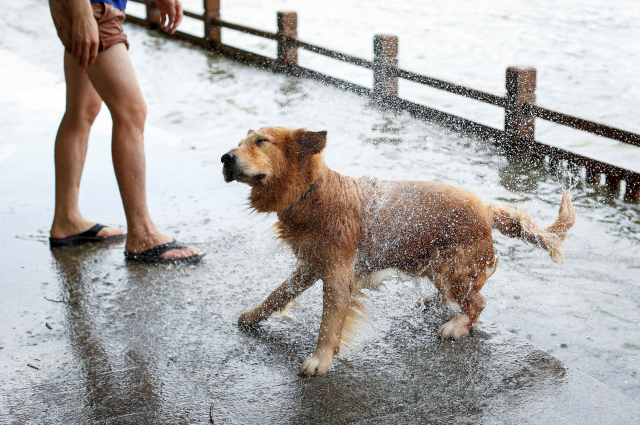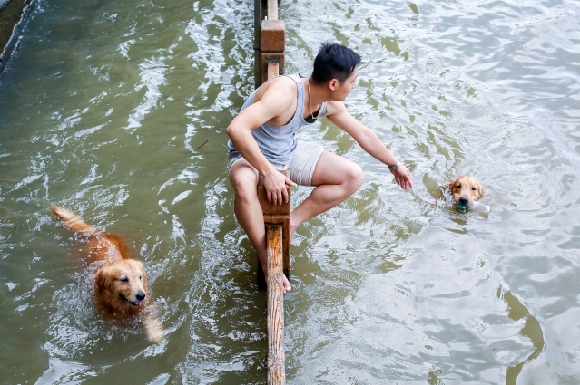 5月16日,濱江中路。經(jīng)歷前段時(shí)間的連續(xù)暴雨天氣后,昨日(16日)廣州天氣轉(zhuǎn)為晴好,珠江漲潮,濱江中路的岸邊,有市民帶著金毛愛犬在岸邊游泳。圖為市民趁著天晴漲潮,帶上愛犬到江邊戲水。廣報(bào)全媒體記者蘇俊杰攝