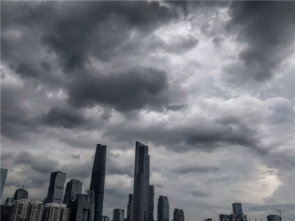 21日下午三點,廣州烏云雷雨滾滾而來,廣州市區(qū)瞬間被雨霧籠罩。