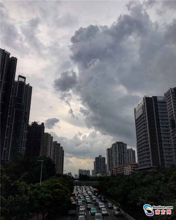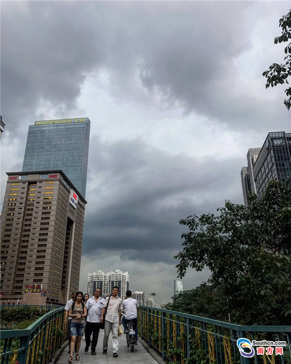 南方網(wǎng)訊 21日下午三點,廣州烏云雷雨滾滾而來,廣州市區(qū)瞬間被雨霧籠罩。