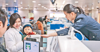 驗證臺上,民警幫助一位懷抱孩子的旅客采集信息。