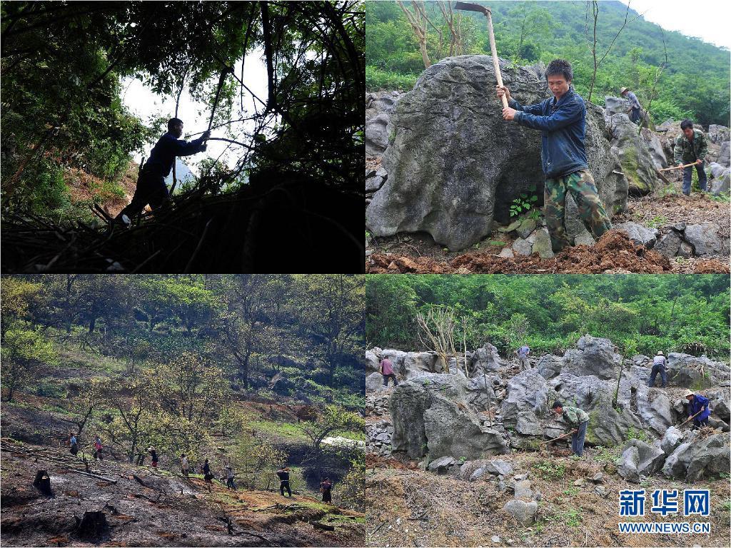 拼版照片:融安縣東起鄉(xiāng)銅板屯村民改造荒山。上左:銅板屯村民龍飛聯(lián)在山上砍雜草(2013年7月23日新華社記者黃孝邦攝);上右:銅板屯村民龍革雄在開(kāi)墾荒地準(zhǔn)備種植李子樹(shù)苗(2013年5月15日新華社記者黃孝邦攝);下左:銅板屯村民們上山開(kāi)荒(2013年3月5日新華社記者黃孝邦攝);下右:銅板屯村民們?cè)诜N樹(shù)(2013年5月15日新華社記者張愛(ài)林?jǐn)z)。新華社發(fā)
