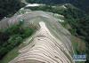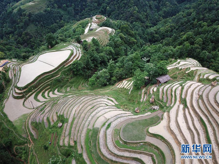5月7日在貴州省榕江縣計劃鄉(xiāng)陽開苗寨拍攝的苗寨梯田景觀(無人機(jī)拍攝)。初夏時節(jié),位于貴州省黔東南苗族侗族自治州榕江縣計劃鄉(xiāng)的陽開苗寨層層疊疊的梯田與古樸的苗寨木樓相互映襯,美如畫卷。新華社發(fā)(楊文斌攝) -