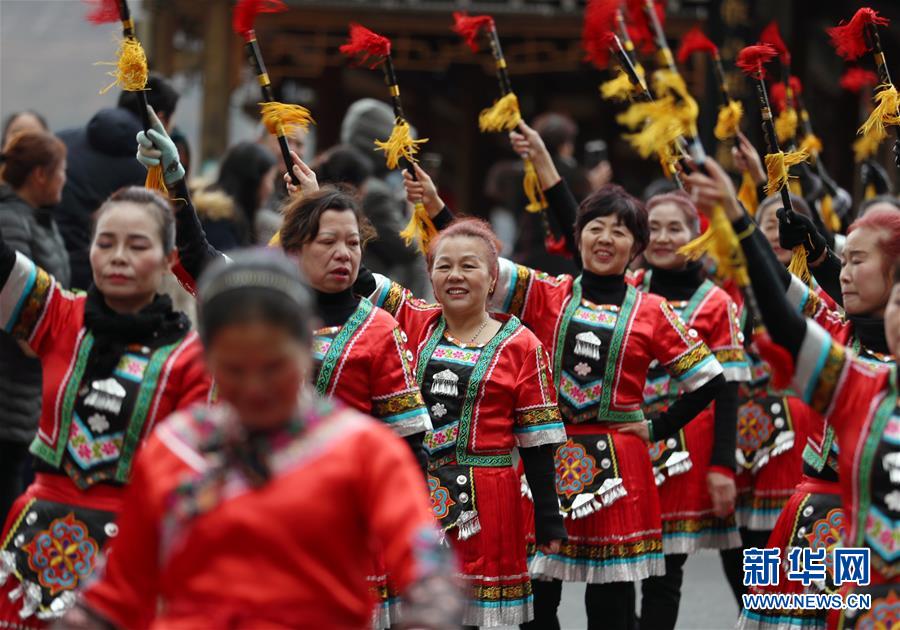 2月9日,金錢桿隊伍在玉屏街頭巡游展演。當日是農歷正月初五,貴州省銅仁市玉屏侗族自治縣舉行“民俗送祝!被顒;、山歌、金錢桿等隊伍輪番巡游,為現(xiàn)場觀眾獻上一場具有民族特色的民俗文化展示,增添了濃濃年味。新華社發(fā)(胡攀學 攝)