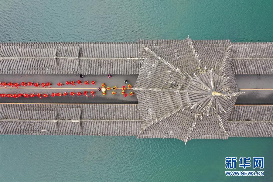 2月9日,花燈隊伍在玉屏風雨橋上巡游展演(無人機拍攝)。當日是農歷正月初五,貴州省銅仁市玉屏侗族自治縣舉行“民俗送祝福”活動;、山歌、金錢桿等隊伍輪番巡游,為現(xiàn)場觀眾獻上一場具有民族特色的民俗文化展示,增添了濃濃年味。新華社發(fā)(姚磊 攝)