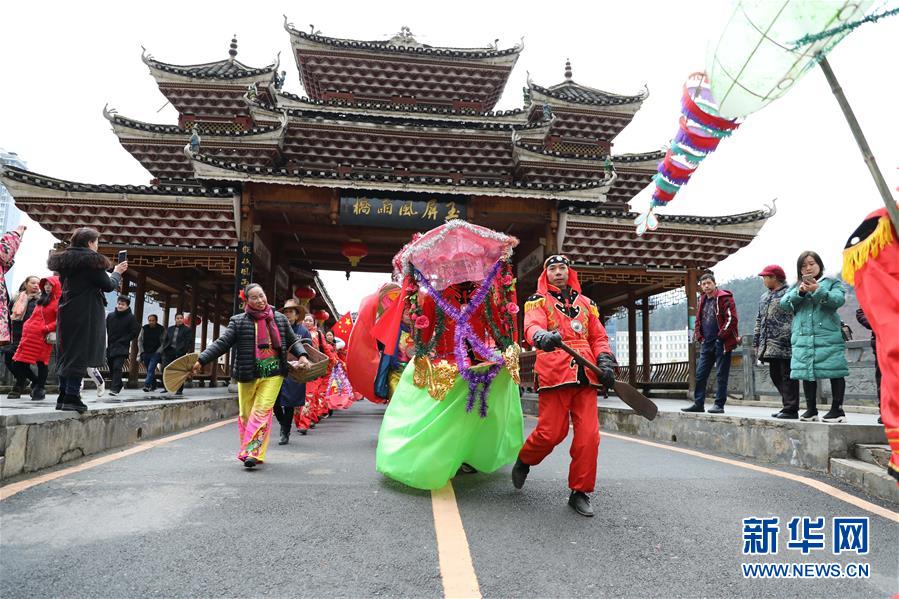 2月9日,花燈隊伍在玉屏風雨橋上巡游展演。當日是農歷正月初五,貴州省銅仁市玉屏侗族自治縣舉行“民俗送祝!被顒。花燈、山歌、金錢桿等隊伍輪番巡游,為現(xiàn)場觀眾獻上一場具有民族特色的民俗文化展示,增添了濃濃年味。新華社發(fā)(胡攀學 攝)