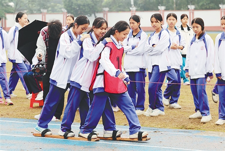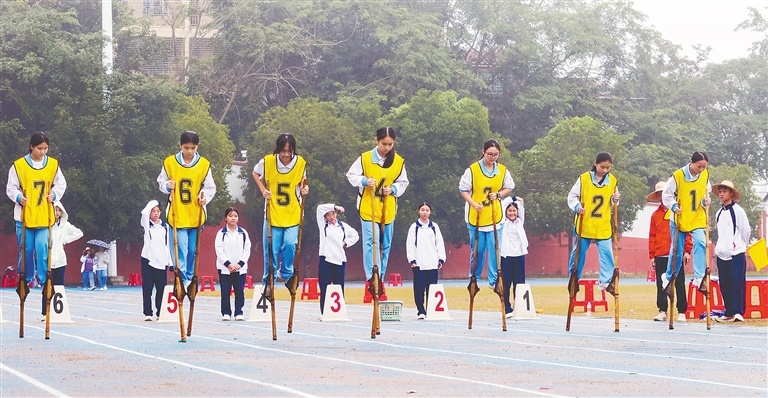 日前,儋州市民族中學(xué)2025年民族體育文化節(jié)暨第24屆田徑運(yùn)動(dòng)會(huì)舉行。除了跳高、100米短跑等常規(guī)田徑項(xiàng)目外,板鞋競(jìng)速、高腳競(jìng)速、押加等豐富多彩的民族傳統(tǒng)體育項(xiàng)目集中亮相,成為此次運(yùn)動(dòng)會(huì)的亮點(diǎn)。